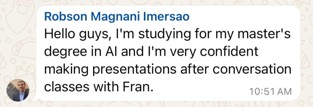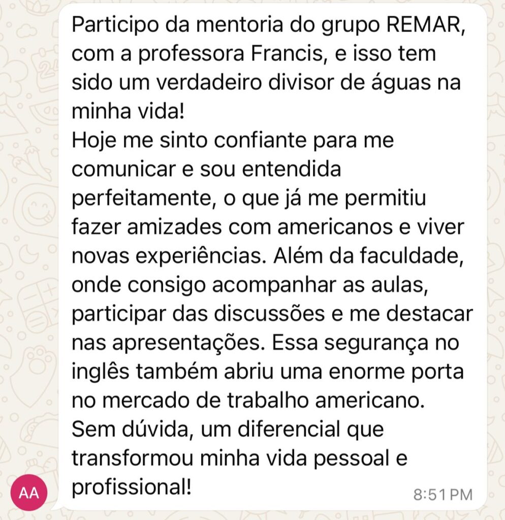 A partir dessa virada, Francis desenvolveu o REMAR — um método com base em neurolinguística, que une repetição, movimento, desbloqueio emocional e aplicação prática à realidade de quem precisa falar inglês de verdade, no mundo real e sem enrolação.