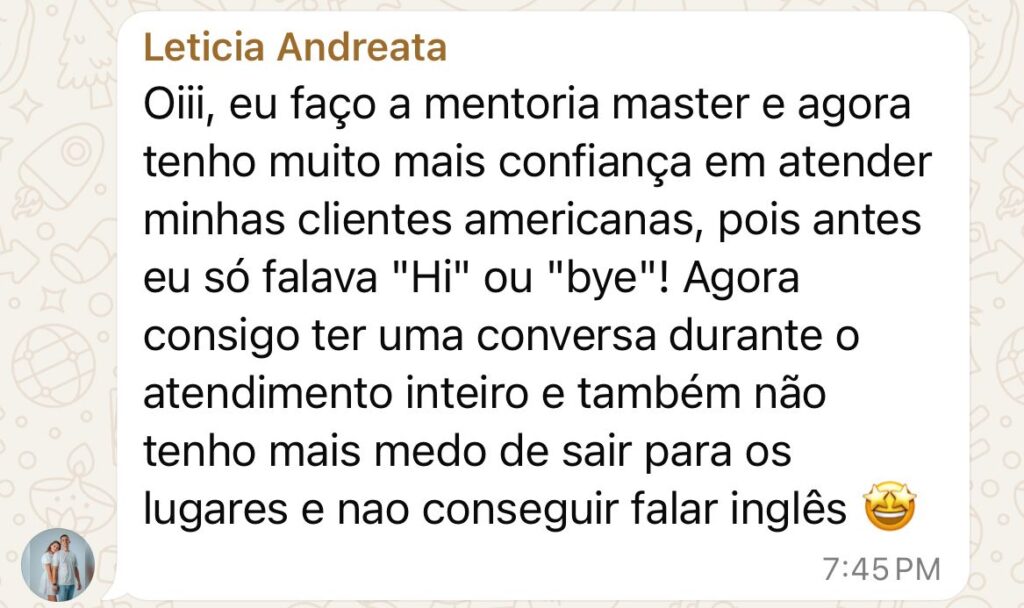 Com disciplina e aplicação do método REMAR, Vicky não só aprendeu, como alcançou um nível de fluência extraordinário, a ponto de ser confundida com uma nativa por americanos. Hoje, além de professora master de inglês, é também tradutora e intérprete profissional, traduzindo com fluência nas duas direções — do inglês para o português e, o mais desafiador, do português para o inglês.